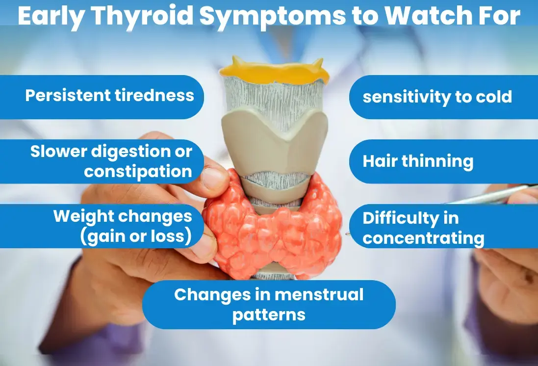 Thyroid symptoms often resemble simple bodily issues, and they build slowly, which is why they are overlooked. For example, fatigue is considered the result of a busy schedule, weight changes get blamed on age, diet, or lifestyle, and low mood or poor concentration is explained by stress or lack of sleep. Hormonal changes can also happen from physical and emotional changes in the body. Whether it’s pregnancy, the post-partum period, or perimenopause, major life transitions also cause symptoms that closely resemble thyroid symptoms. Such resemblance makes it harder to identify whether they’re resulting from thyroid or some other issue.